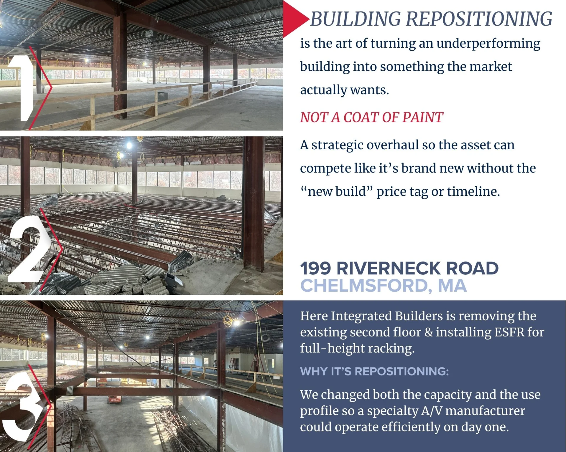 Turning legacy space into market-ready space. We are upgrading a 93,852 SF base building and delivering 23,584 SF of tenant space. Scope includes removing the existing second floor and installing an ESFR system for full-height racking, creating a mix of warehouse, office, manufacturing, support, and conferencing areas for a specialty A/V firm.