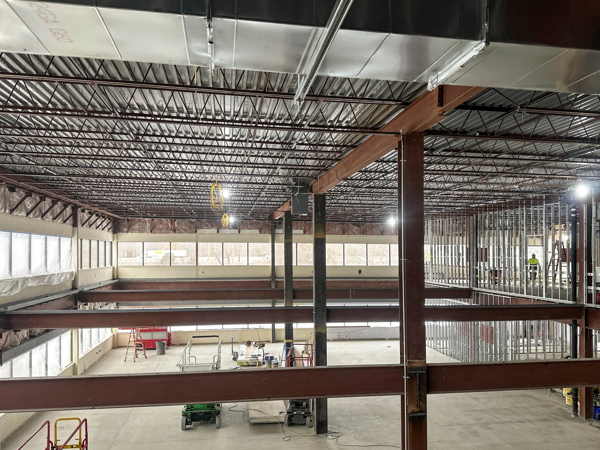 Progress update at 199 Riverneck Road in Chelmsford, MA. We’ve removed the existing concrete floor deck and select second-floor steel framing to create an open, two-story volume designed to support future high-bay racking. You can also see metal stud wall framing advancing & electrical, mechanical, and plumbing rough-ins taking shape throughout the space.